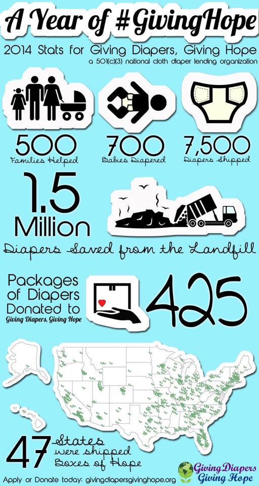 Giving Diapers Giving Hope is a non-profit organization that has helped eliminate diaper need for over 1,000 families in the United States since 2011. They loan a set of cloth diapers to qualified families for the cost of shipping. They provide 16 changes worth of diapers for families with one child in diapers and 20+ changes worth for families with two or more children. Cloth diapering can help these families afford the other necessities they need like food and shelter while still caring for their children because despite what most may think, 60% of families living below the poverty line still have access to a washing machine.