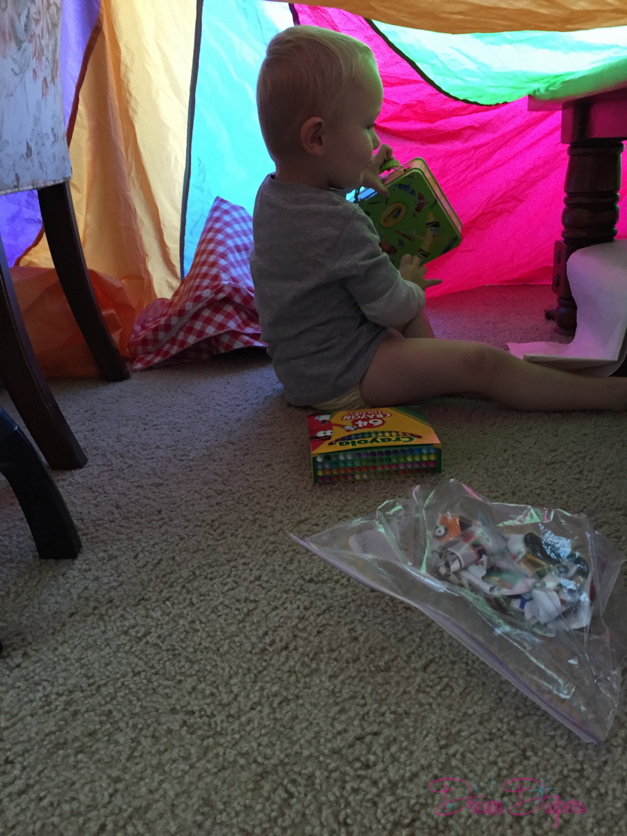 Do you have a few dining room chairs? A few heavy books? A bed sheet or a parachute (thanks Gymboree)? Then you, my friend, have a tent…or a fort or a secret hideout or a castle etc. etc. There’s something magical about having your own private space. As moms we relish the idea of even a bathroom to ourselves, but toddlers go bananas for tents, even if it’s just a place to crawl into and look at books, color, or chat with momma.