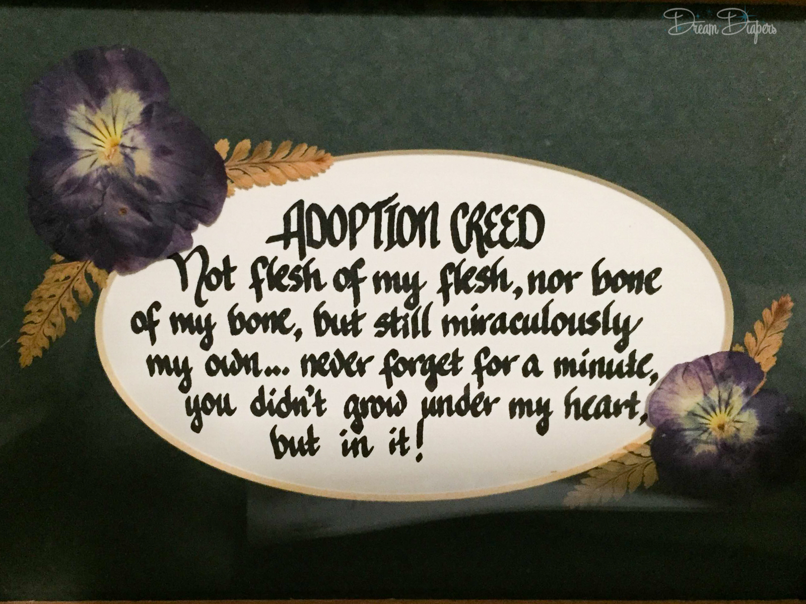 In the birthmother letter that we wrote, we said something like, “We don’t want it to be ‘my adopted child.’ It’s something about you; it doesn’t define you, just like the color of your hair or the color of your eyes. It’s important that it’s something about you, not the thing about you. It’s more important that you’re kind to people and try hard in school.” My dad had also cut out this poem from the newspaper that echoed my philosophy: “Not flesh of my flesh, nor bone of my bone, but still miraculously my own. Never forget for a minute you didn’t grow under my heart but in it.” My dad used to carry the newspaper clipping in his wallet and reminded me about it when we started the adoption process. We used that poem in the header of our letter, and when Aidan was born, his birthmother gave him this: