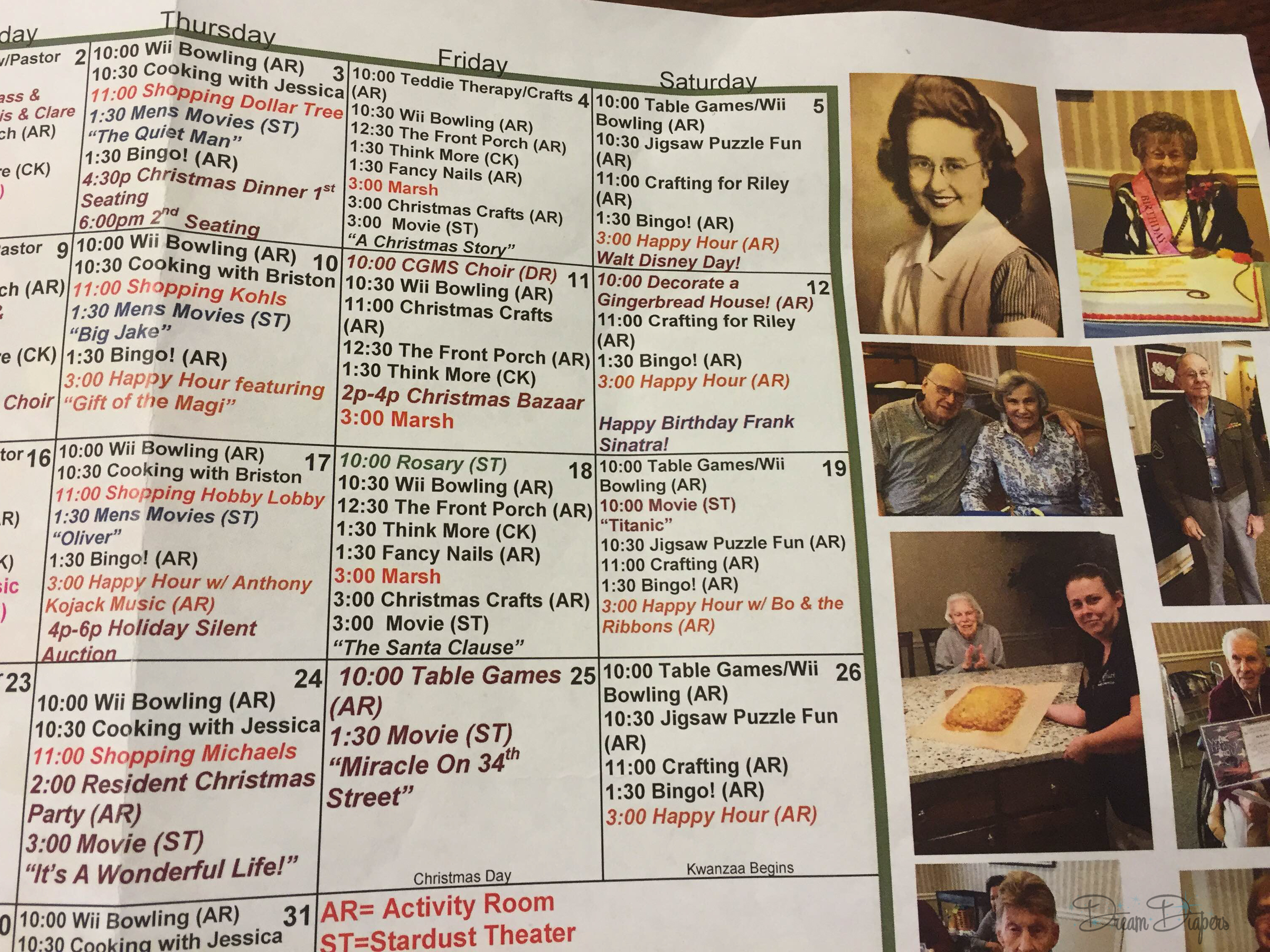 We donated 4 large poinsettia plants (thanks mom and dad!) and made the activity director’s day. She gave us a calendar of this month’s activities so we can come back and color with residents, paint, sing, or even play games.