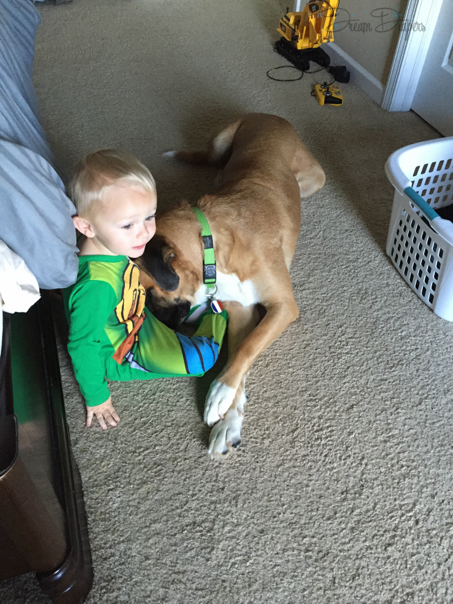 We had rescued a dog from our local shelter about a month before we even knew Feeny was sick, (if that’s not a God thing, I don’t know what is) but this dog was so different from Feeny. Enzo was skittish and didn’t know how to play at first. He didn’t chase tennis balls or play tug of war. He didn’t like playing keep away with his stuffed toys. For a few months, he didn’t even like Lucas to snuggle him. Enzo had been beaten by his former owner (an elderly man with dementia) and clearly treated very badly. Despite his former life, he was sweet and loving and extremely tolerant of Lucas. Lucas’ sudden movements startled him for the first few months, though, and he would hide under the table at any loud noises. Enzo never had any sense of security in his old home, and now that he’s here with us, we’re providing that for each other.