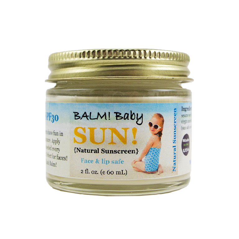 BALM! Baby Sun is a natural mineral sunscreen that is safe for all ages and is safe for baby’s face. It contains 25% NON-nano zinc, meaning the zinc particles are not small enough to infiltrate through the skin; they stay on the surface to create a natural barrier to the sun’s harmful UV rays.